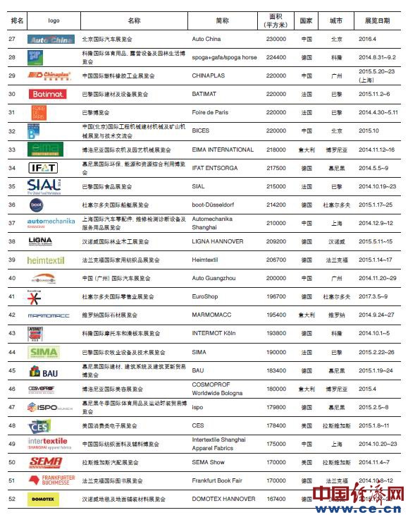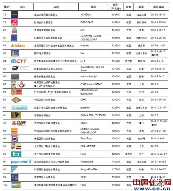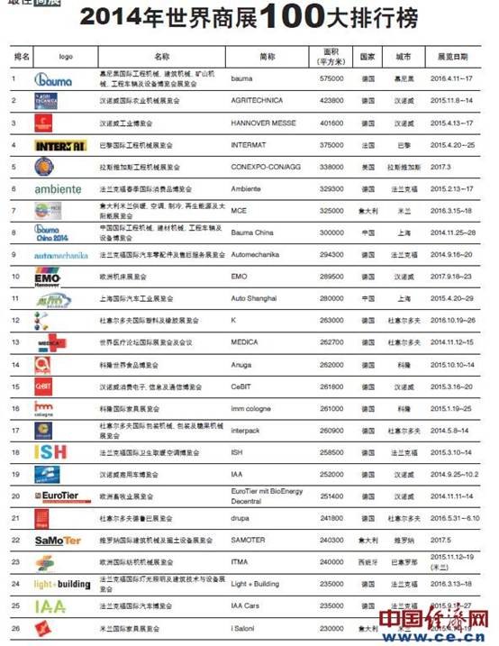 前不久,由《進(jìn)出口經(jīng)理人》雜志社主辦的2014進(jìn)出口經(jīng)理人年會暨中國外貿(mào)市場報(bào)告發(fā)布會在京舉行。會上發(fā)布了2014年世界商展100大排行榜,榜單顯示,100大中的中國展覽平均面積均低于平均面積,但發(fā)展迅猛,這顯示出雖然中國展覽還遠(yuǎn)未占據(jù)主導(dǎo)地位,但擴(kuò)張迅速,為全球商展發(fā)展貢獻(xiàn)強(qiáng)勁動力?,F(xiàn)在,畢加展覽小編就跟大家聊一聊,我們先看這份排名: