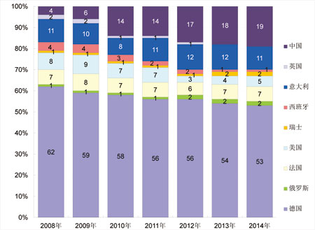 通過新榜單我們不難發(fā)現(xiàn),各展覽大國仍堅(jiān)守著各自的份額。榜單變化不大,相對增長緩慢,中國展覽份額正穩(wěn)步上升,2008年中國在100大排行榜中僅占4席,到2014年達(dá)到19席,成為世界商展的主要舉辦國。面對這樣的局面,德國展覽公司并不著急,德國的同行早已先行一步,開啟了全球辦展的步伐,并取得了積極成就,在中國的大型展覽中,有一部分正是德國展覽在中國的子展,見圖3。