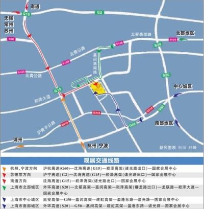 上海市北部城區(qū):外環(huán)高速(S20)—北翟高架—嘉閔高架—崧澤高架(蟠龍路出口)—龍聯(lián)路—崧澤大道—國家會(huì)展中心