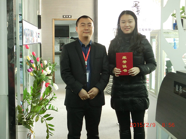 工作安排后是對員工的頒獎儀式,業(yè)務(wù)部助理周卓曉年后將結(jié)束自己的實習期,回到學校繼續(xù)課程的展開,她為公司業(yè)務(wù)部的付出,對年會策劃的共享我們不會忘記,為了表揚她一直以來的敬業(yè)精神,今天由業(yè)務(wù)總監(jiān)李春忠為她頒發(fā)了“最佳實習獎”獎項,鼓勵她日后做得更好,飛的更高。