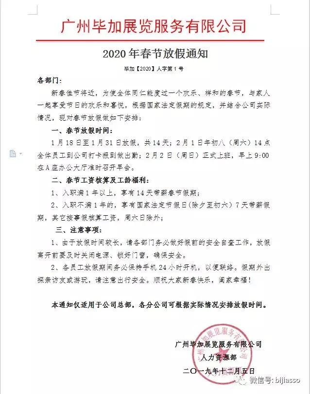 春節(jié)放假時間:1月18日至1月31日,共14天,2月1日年初八(周六)14點全體員工到公司打卡報到做出勤;2月2日(周日)正式上班,早上9:00在A座辦公大廳準時召開早會。