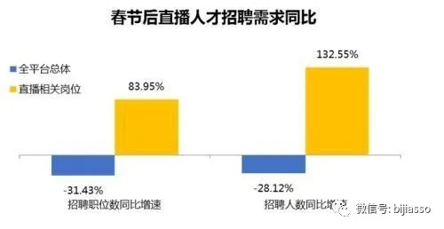 2020年春節(jié)復(fù)工后一個(gè)月內(nèi),直播相關(guān)崗位招聘職位數(shù)同比上漲83.95%,招聘人數(shù)增幅高達(dá)132.55%。