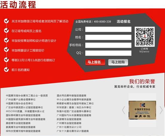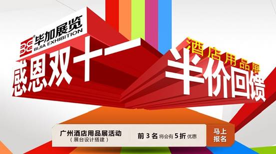 十一月是感恩的日子,為了回饋廣大新老客戶對我司的支持和厚愛,畢加展覽特推出酒店用品展展臺半價回饋客戶活動。只要您現(xiàn)在報名聯(lián)系我們,并在11月11日11時開始的活動中搶到前3位簽訂合同名額,您就可以獲得展臺半價的優(yōu)惠。