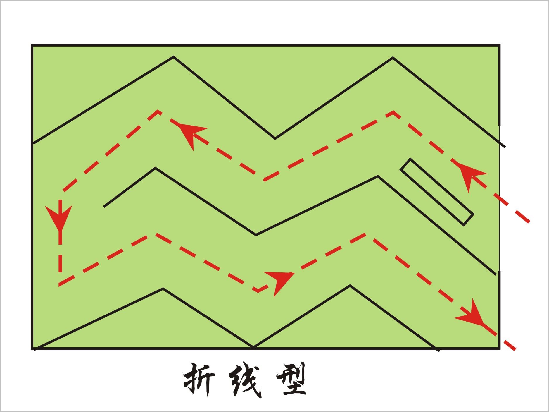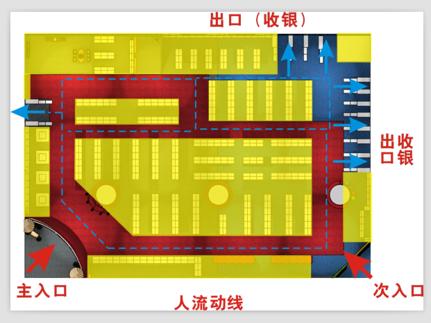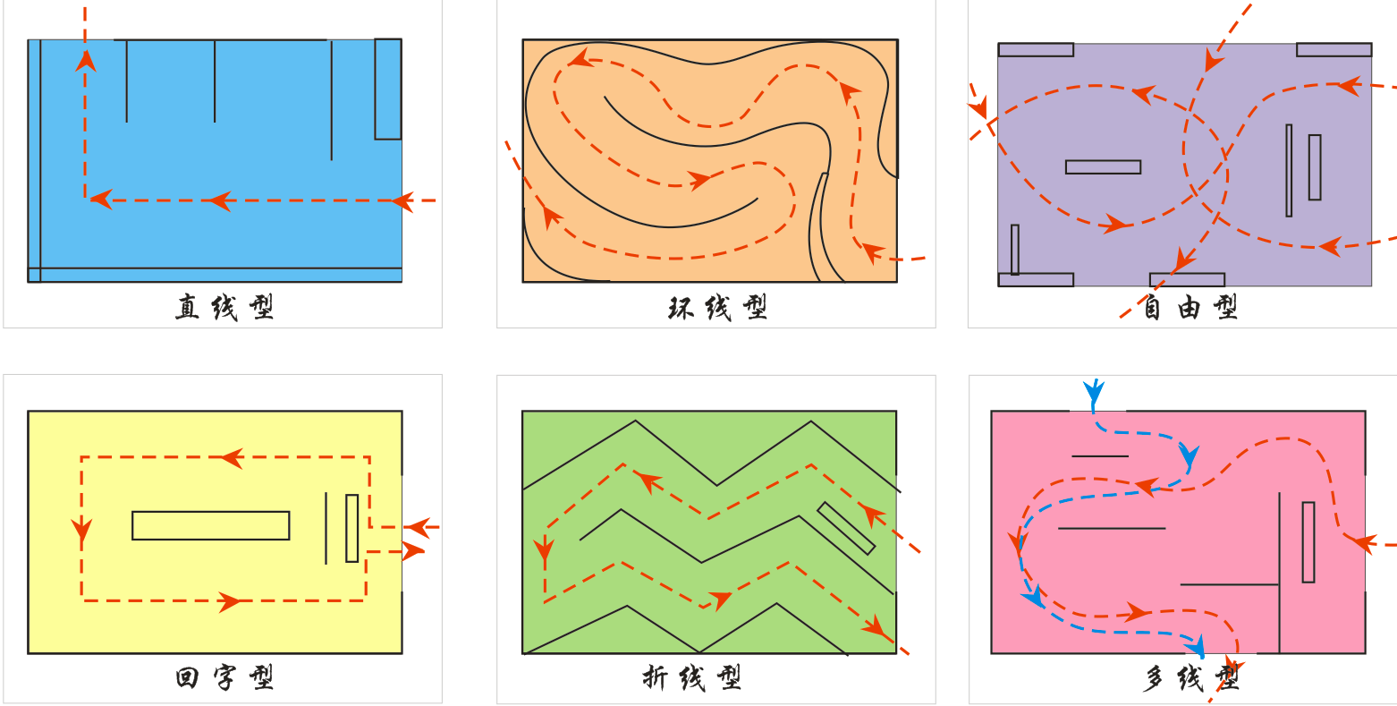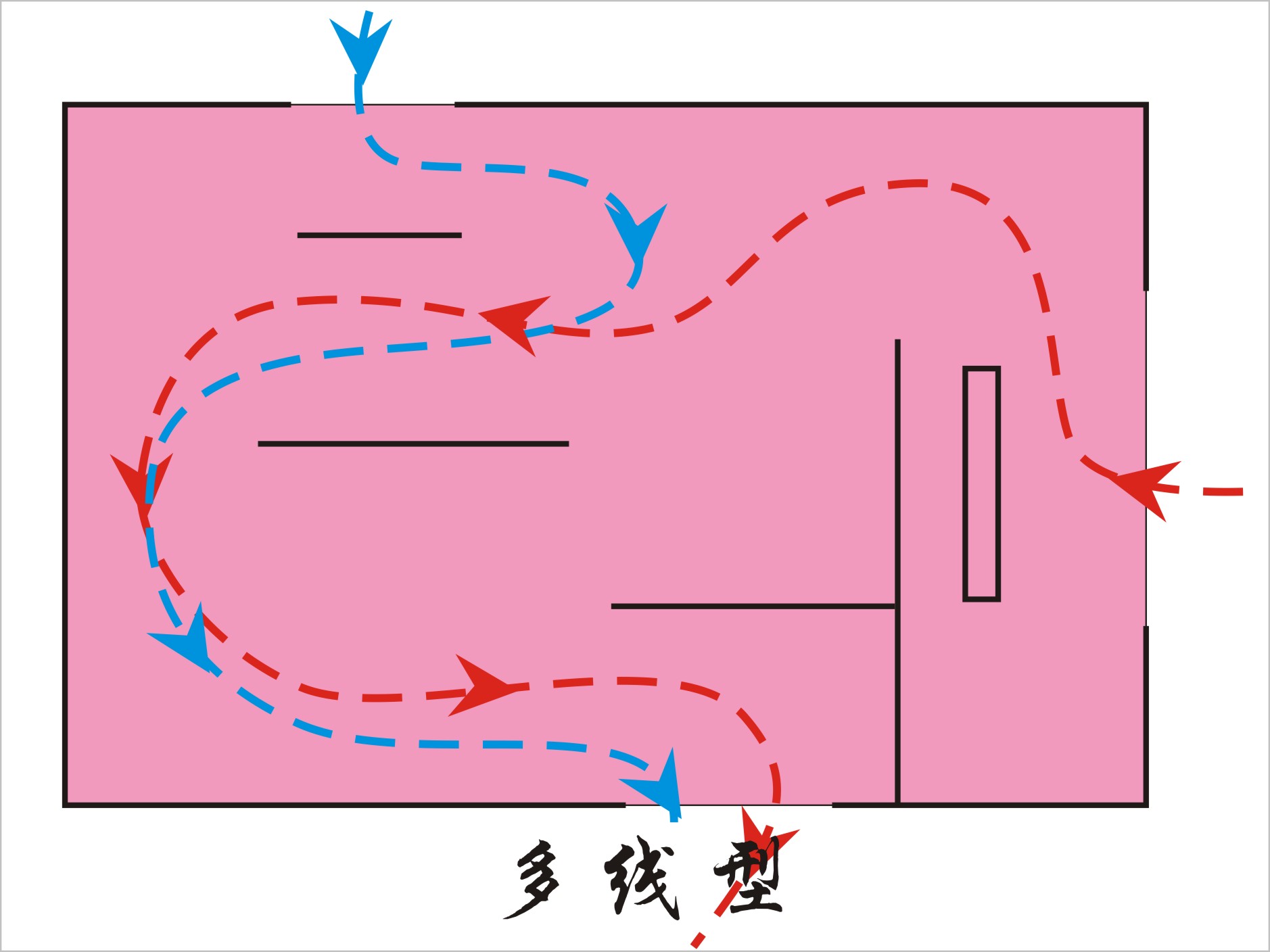 2、環(huán)線路線:在一些三面圍合的空間中入口和出口在同一側(cè)。人流進(jìn)入空間場(chǎng)所之后,經(jīng)過環(huán)線流動(dòng)又從同一側(cè)的出口離開,環(huán)線流動(dòng)的空間場(chǎng)所比較復(fù)雜,理想的人流路線,要能使人流按順序看遍所有物體,將人流視點(diǎn)集中于暢銷區(qū),盡可能避免人流相對(duì)或重復(fù)穿行。