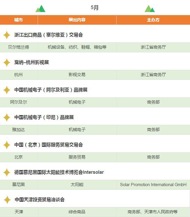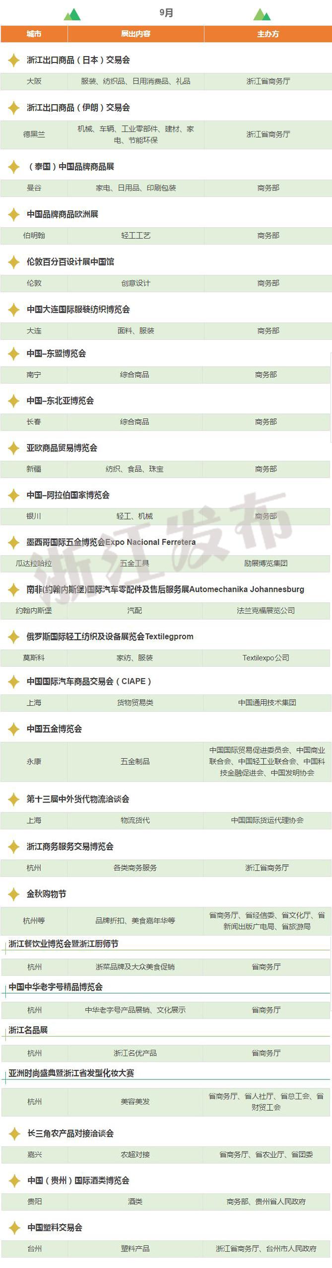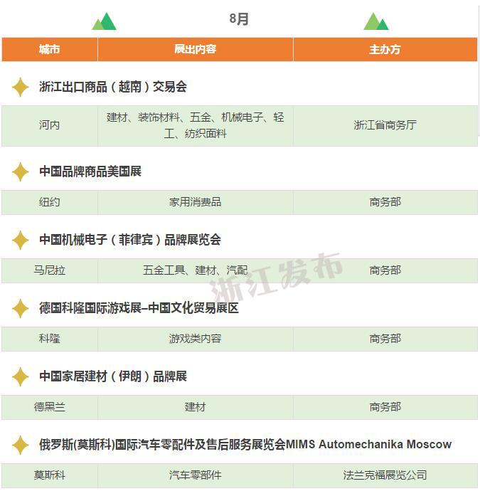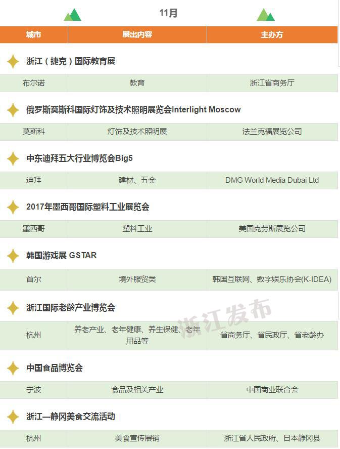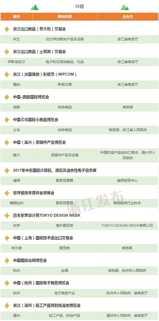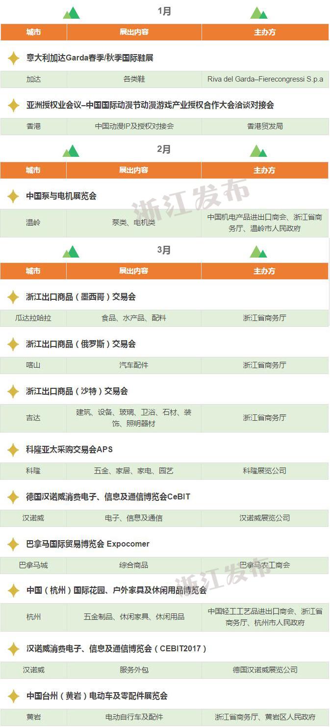 2017年,浙江將重點(diǎn)舉辦和支持96個(gè)展會(huì),其中自辦類(lèi)貨物貿(mào)易展會(huì)12個(gè),自辦類(lèi)服務(wù)貿(mào)易展會(huì)5個(gè),境外政策性重點(diǎn)展17個(gè),境內(nèi)政策性重點(diǎn)展11個(gè),其他類(lèi)重點(diǎn)展36個(gè),商貿(mào)流通展會(huì)15個(gè)!