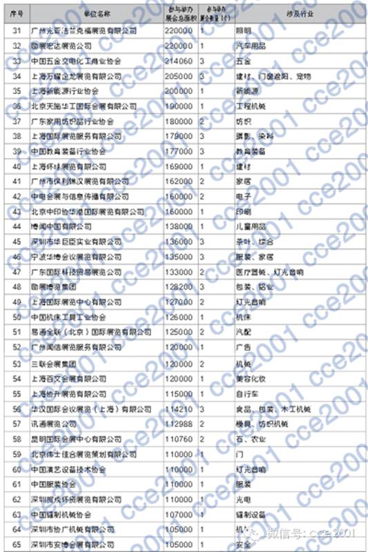 e) 附件中的百強(qiáng)名單是按照各單位2013年度參與舉辦的規(guī)模以上展會總面積順序排列,同時公布了2013年度參與主辦的規(guī)模以上展會數(shù)量和涉及行業(yè);由于不同行業(yè)之間存在很大區(qū)別,因此該排序只是一個參考,不能全面反映各單位之間的實力差距;?