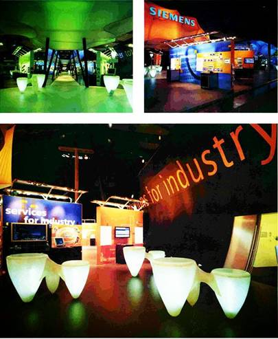 2、形象統(tǒng)一化風(fēng)格。即以參展商CIS戰(zhàn)略形象為統(tǒng)一標(biāo)志,運(yùn)用于其參加的所有的國(guó)際性、區(qū)域性展覽活動(dòng)的展示設(shè)計(jì)中。一些大型品牌企業(yè)都有自身企業(yè)形象的標(biāo)準(zhǔn)化圖形、字體、色彩等要素及其特殊結(jié)構(gòu)的道具等,他們?cè)趨⒓訃?guó)內(nèi)外的系列展覽活動(dòng)時(shí),都規(guī)定展示設(shè)計(jì)者在其企業(yè)文化形象框架內(nèi)設(shè)計(jì)展臺(tái),以突顯該企業(yè)的獨(dú)特個(gè)性形象。這種統(tǒng)一形象風(fēng)格的展示設(shè)計(jì),能強(qiáng)化觀眾對(duì)該企業(yè)文化形象的視覺(jué)記憶。
