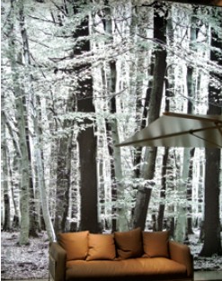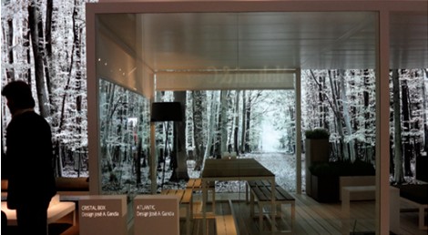2012年米蘭家具展某戶外家具品牌則大膽采用噴繪作為整個(gè)展廳的主背景,且效果甚佳。我們發(fā)現(xiàn),在其三面開敞的展位上,僅有一個(gè)背景墻,設(shè)計(jì)師將其全部覆蓋噴繪布。在這個(gè)以森林為場景的噴繪中,意大利人對角度的選取、對光線的處理以及對色彩的拿捏十分完美。一方面茂密的森林很好營造出戶外的意境,給人逼真的視覺效果,另一方面灰白的色調(diào)處理將背景與家具的層次有效拉開,背景的陪襯作用恰到好處,戶外家具的主體地位得到凸現(xiàn),主次分明、虛實(shí)結(jié)合。
