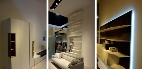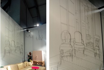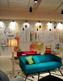 這是一家做現(xiàn)代風(fēng)格布藝沙發(fā)的品牌,整個(gè)展廳的背景均通過墻面的繪畫來表達(dá)。試想在中國,同樣的布藝沙發(fā),我們往往會通過豪華的裝修來營造各式客廳空間,休閑的、都市的、田園的等等,以及各種復(fù)雜的吊頂、背景墻、吊燈、裝飾畫、織物來配合。不僅花費(fèi)較高,場景的靈活多變性也十分受限。米蘭展上的這家現(xiàn)代布藝沙發(fā)的展廳給了我們一個(gè)全新的思維,以繪畫手法做出的背景墻簡單而實(shí)用,更可貴的是,簡單的線條和輕松的色 塊將布藝沙發(fā)所倡導(dǎo)的閑適、自在、追求浪漫的生活態(tài)度一并呈現(xiàn)在了我們面前。