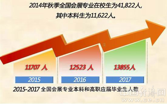 根據(jù)最新統(tǒng)計,2014年我國會展教育保持較快發(fā)展勢頭,全國招收會展新生14293人,較上年增加10.2%。新生入學后,全國會展專業(yè)在校生規(guī)模達41822人,創(chuàng)歷史最高水平。2015-2017會展專業(yè)