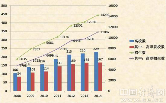 2014年,全國開設會展專業(yè)的高等院校為229所,其中高職167所,占72.9%;招收新生14293人,其中高職11087人,占招生總數(shù)77.6%。會展院校數(shù)和招生數(shù)歷年變化情況見圖2。